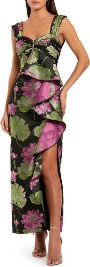 Brocade cap sleeve ankle-length dress featuring a ruched bodice, cascading ruffle detail, and front slit. Vibrant floral print adds a bold, feminine touch.
