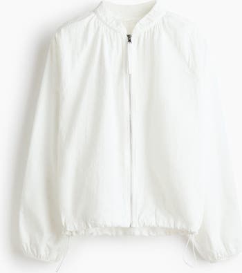 Oversized jacket in an airy cotton weave with broderie anglaise. Features a pleated stand collar, zip down the front and discreet side pockets. Long raglan sleeves with covered elastication at the cuffs and an elasticated drawstring at the hem with cord stoppers at the sides. Lined.