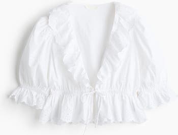 Short blouse in a cotton weave detailed with broderie anglaise and scalloped edges. Features a deep V-neckline with a frill trim and an open front with a concealed hook-and-eye fastener and narrow ties at the waist. Elbow-length sleeves with narrow elastication and a frill trim at the cuffs, and an elasticated seam with gathers at the waist creating a gently flared hem.