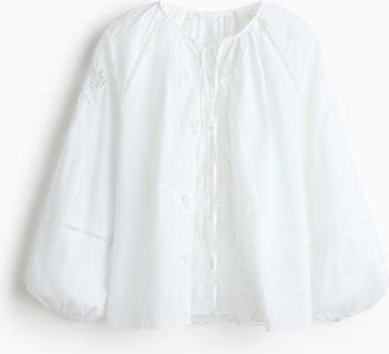 Oversized blouse in a cotton weave detailed with broderie anglaise and ladder lace insets. Round neckline with gathers all around and narrow ties at the front, and covered buttons down the front. Long, raglan balloon sleeves with narrow elastication at the cuffs, and a scalloped hem.