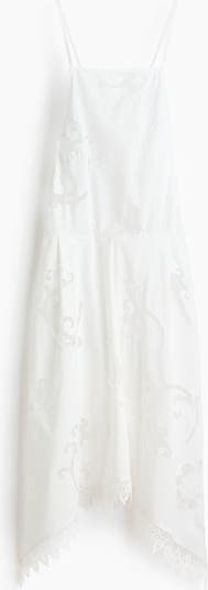 Knee-length dress in an airy cotton weave with broderie anglaise. Straight cut at the top, a low-cut back and spaghetti shoulder straps that cross, thread through small loops and tie at the back. Fitted bodice, a visible seam at the waist and a gently flared skirt with a curved, scalloped hem. Unlined.