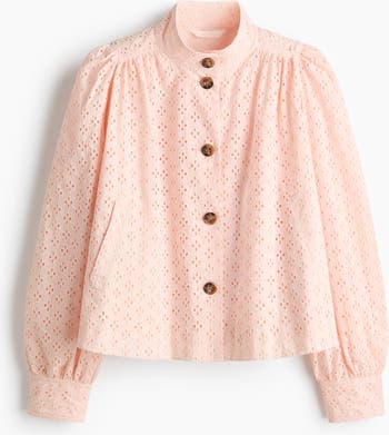 Short, oversized jacket in a cotton weave with broderie anglaise. Features a stand collar, buttons down the front and welt side pockets. Forward-facing shoulder seams with gathers, a yoke with gathers at the back and long puff sleeves with gathers and buttons at the cuffs. Cotton lining.