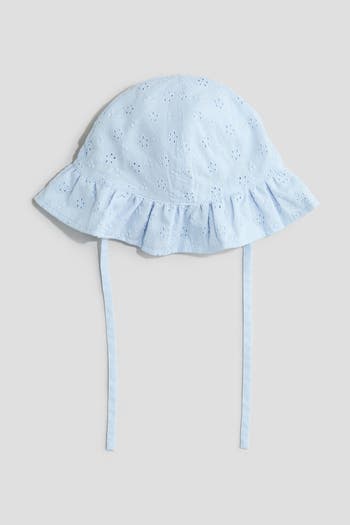 Sun hat in a soft cotton weave with broderie anglaise and ties under the chin. Lined.