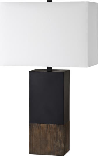 Warm pinewood, sleek black iron and off-white cotton come together in this contemporary table lamp that brings a designer quality to your modern living room.