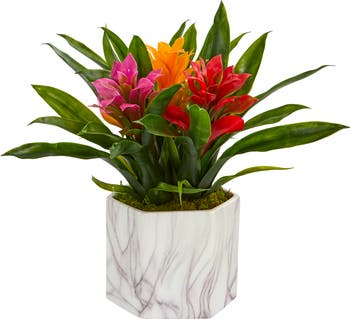 Bright colors can often rejuvenate an otherwise dull room. With passionate bright blooms that accent and sit nestled with in its green foliage, the artificial bromeliad plant that comes in a marble vase will do just that: stimulate and add energy to your living space. Use this brilliant ornament as a centerpiece on your formal dining room table. You can surround it with other marble vases, silverware, and red napkins for a complete look.