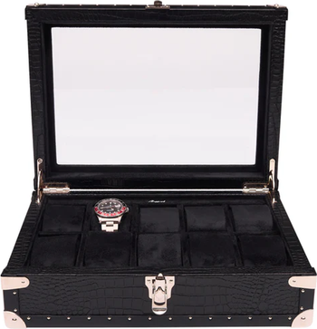 Introducing our new luxurious watch box, crafted from Italian crocodile-effect leather with chrome fitments and a unique studded design. This elegant box holds up to ten watches, featuring a glass roof for easy viewing, suede lining, and adjustable cushions with removable sleeves. Combining the best of our Brompton and Optic designs, it's the perfect home for your prized collection.