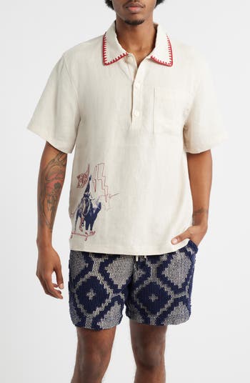 It's not your first rodeo so build that look with the contrast stitching and eclectic print of this button-up cut from a cool, breathable linen fabric.