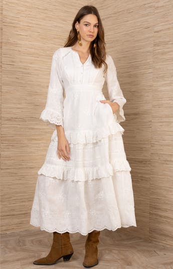 A romantic washed linen maxi dress with delicate embroidery, tiered ruffles, and an easy, flattering silhouette.