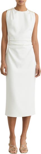 Rippled waistline ruching enhances the figure-skimming silhouette of this sleeveless midi made with golden shoulder embellishments and finished with an airy back slit.