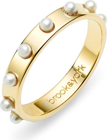 This American-made ring plated in 14-karat gold is both cool and elegant with its imitation-pearl studs all around.