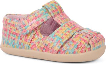 A colorfully woven upper highlights the fisherman-inspired silhouette of a breezy sandal fitted with a wide toe box and a slip-resistant sole to encourage confident early steps.