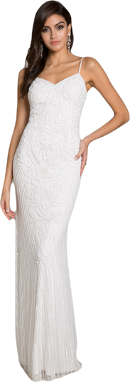 Beautiful white long dress embellished with beads, sequins. It has a sweetheart neckline with spaghetti straps
