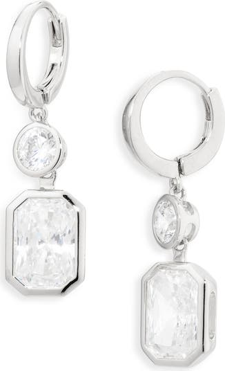 Intricate facets catch the light on these stunning hand-polished drop earrings showcasing bezel-set cubic zirconia in gorgeous round and emerald cuts.