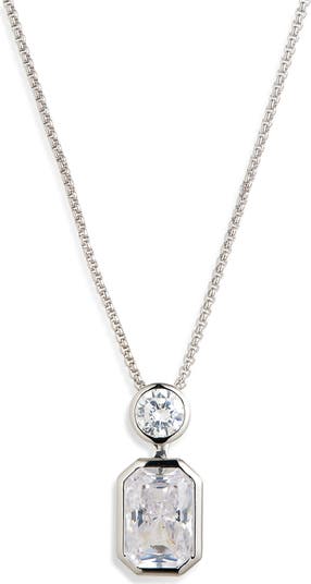 Add elegant sparkle to your look with this hand-polished necklace showcasing bezel-set cubic zirconia in gorgeous round and emerald cuts.