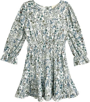 The Brooklyn Dress is a delightful blend of elegance and comfort, perfect for your little one's everyday wear. Its adorned with a nature-inspired floral pattern in soft green and blue hues, adding a subtle yet eye-catching touch. Detailed ruffles accentuate the sleeves and hemline, complementing the flared skirt for a whimsical twist.