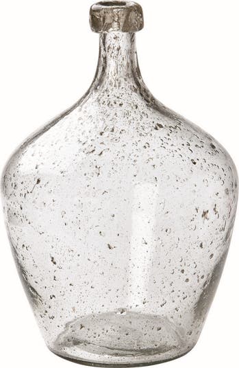 beautiful glass vase features molten glass that is taken from the furnace and rolled over pebbles, then mouth blown into a mold to develop the shape... giving it a textured organic feel. light plays off the irregular pieces molten into the glass, offering a unique look to any decor. slight variations are to be expected. each piece is one-of-a-kind, no two pieces will be exactly alike.