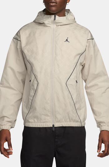 A lightweight nylon shell patterned in a latticework of tonal Jumpman logos brings on-court energy to an off-court track jacket topped with a high-neck hood for added coverage in the weather. Lined with ventilating mesh, it makes a great choice for warming up, cooling down and chilling out wherever your game takes you.