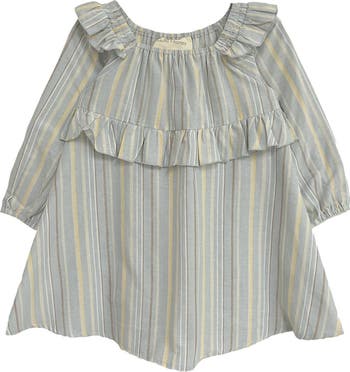 Soft pastel hues and an enchanting stripe pattern make the Brooklyn Dress a delightful wardrobe staple. Designed with an elastic neckline and puffed sleeves, this dress offers comfort with plenty of style. Thoughtful ruffle details along the neckline and chest add a playful touch, while its flowing silhouette is ideal for twirls and movement, making it perfect for your little one?s adventures. Fabric Content & Care 100% COTTON Machine Wash Cold | Line Dry | Do Not Bleach