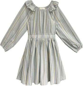 Elevate her everyday style with the Brooklyn Dress, a delightful blend of flair and comfort. Its vertical stripes in shades of blue, yellow, and white create a design that?s easy to pair for any occasion. The ruffled neckline and gathered waistline add a playful look, while the slightly puffed long sleeves complete the look with an elegant touch. Lightweight and versatile, it?s a perfect pick for her daily adventures! Fabric Content & Care 100% COTTON Machine Wash Cold | Line Dry | Do Not Bleach