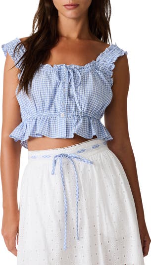 Summery checks cover this lightweight top featuring a flouncy peplum, ruffle trim and an adjustable tie neck.