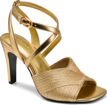 Rope-inspired straps and smooth faux leather bring textural interplay to a metallic sandal featuring an angular square toe and tapered demi heel for architectural balance.