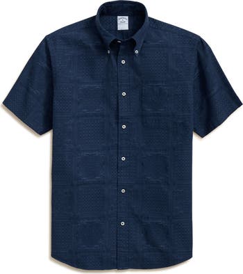 Regular Fit Patchwork Jacquard Short Sleeve Cotton Button-Down Shirt
