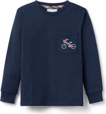 This navy long-sleeve tee is the perfect fall essential for your little one. Made from soft, breathable fabric, it features a fun bike graphic on the pocket. Comfy, stylish, and ready for adventure—perfect for school days or weekend outings.