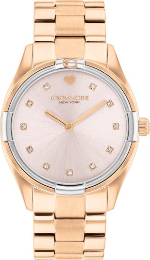 Noon and midnight will forever pluck at your heartstrings wearing this bracelet watch that balances elegance and charm between the 11 crystal hour markers and the heart icon in the 12 position.