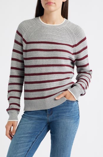 Mixed stitches lend soft texture to this casual raglan-sleeve sweater featuring classic stripes and tipped edges.