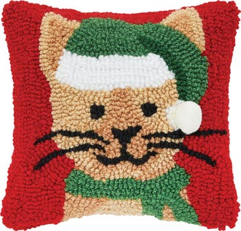 - This decorative pillow features a cute brown cat wearing a green Santa hat, hooked with rich texture and color. Its detailed craftsmanship captures a whimsical Christmas spirit that brightens any living space during the festive winter season.