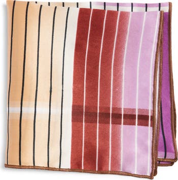 Bright and colorful, this striped silk pocket square brings an unexpected pop and a polished finish to any formal or semiformal outfit. It pairs well with smooth, solid fabrics, but there's always room for mixing patterns and textures to define your personal look.
