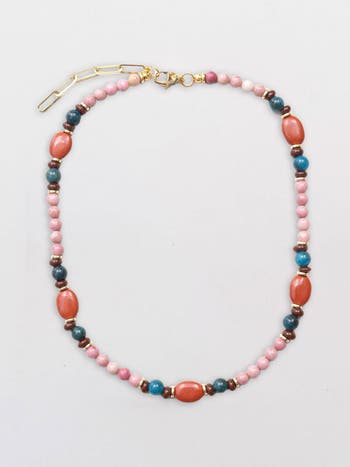 Our BROWNSTONE Necklace is hand-strung with a mix of natural beads including soft pink glass, ceramic teal rounds, earthy brown wood, and bold terracotta beads, accented with gold-plated spacers and a sleek paperclip chain detail at the clasp. Versatile and vibrant, it can be worn solo for a colorful statement or layered with your other pieces for the perfect finishing touch.