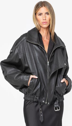 The Bruna Jacket is a bold, oversized take on the classic moto silhouette. Crafted from supple black leather with a rich grain texture, it features an asymmetrical front zip, wide notched lapels, and silver-tone hardware for an edgy finish. Adjustable side buckles and a belted hem add both style and structure.