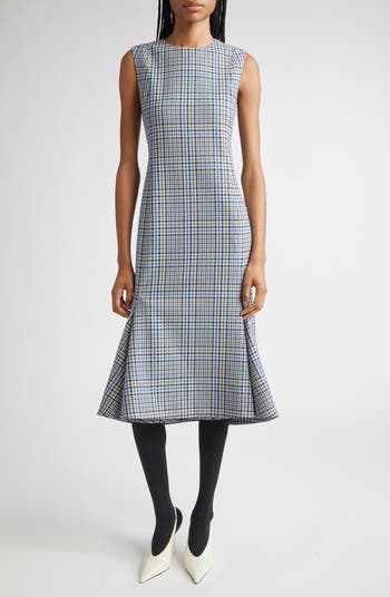 A sheath until it's dramatically not, this plaid midi is uniquely tailored to flare in a variation on a fishtail hem for a solidly polished look that finishes with the dressmaking equivalent of a smile.