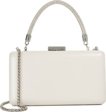 A jewel-encrusted top handle underscores the elegant allure of a leather frame clutch featuring an optional chain strap for hands-free wear.
