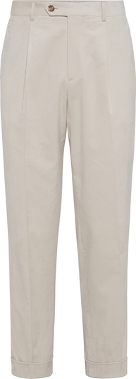 - Zip closure with button, metal hook and backing buttonSlanted front pocketsPleatBack welt pocketsCuffed hemLining to knee
