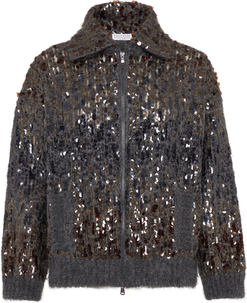 The style showcases a refined dégradé embroidery made of two colors of sequins: one tonal to the base and the other a contrasting color. The two together create sophisticated, shiny shading. The embroidery is made on a knitted net-like base of brushed mohair and wool, and is performed vertically to preserve the garment’s structure and elasticity.