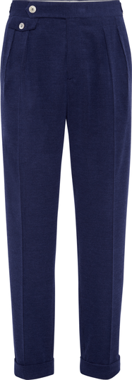 - Zip closure with button, metal hook and backing buttonSlanted front pockets with watch pocketDouble pleatBuckles on the sideBack welt pockets with buttonCuffed hemLining to knee