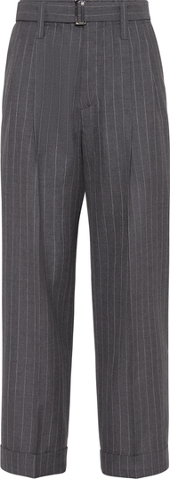 - Zip closure with metal hooks and backing buttonDetachable ring beltElastic waistbandSlanted front pocketsBack welt pockets with buttonPleatCuffed hemUnlined