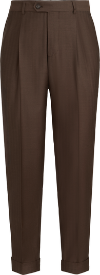 - Zip closure with button, metal hook and backing buttonSlanted front pocketsPleatBack welt pocketsCuffed hem