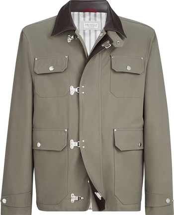 The techno cotton gabardine uses twisted threads that accentuate the fabric’s compact, comfortable and crisp texture, completed by a technical fiber component that provides water-resistant properties. A soft leather lining elevates the garment’s style.