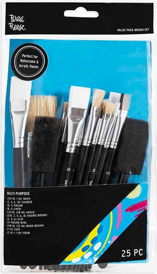BREA REESE: VALUE PACK 25 PC BRUSH SET - The Brea Reese Value Pack 25 pc Brush Set is a comprehensive collection designed for artists who demand versatility and quality in their brushes. Made with natural boar bristles, these brushes are durable, absorbent, and excellent for holding paint. The range of sizes and shapes, from fine liners to broad wash brushes, allows you to tackle any project, whether you’re working with watercolors or acrylics. This set is ideal for those who enjoy switching between different painting techniques, giving you the flexibility to create everything from sweeping landscapes to intricate designs. This 25-piece set is perfect for both beginner and professional artists looking to explore a variety of painting styles. Create vibrant watercolor florals, layer acrylics for mixed-media projects, or add fine lines to detailed portraits. Whether you're working on large canvas pieces or small, intricate designs, this set has every brush you'll need for your next masterpiece. The kit comes complete with a convenient storage pouch, making it easy to keep your brushes organized at home or take them with you to workshops or outdoor painting sessions. Value Pack Brush Set INCLUDES 25 brushes and 1 storage pouch.