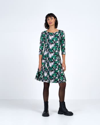 A fit and flare dress crafted from brushed viscose jersey. The softly flowing skirt, shaped with godet panels, creates gentle movement and a subtle swing, while the knee-length cut, boat neckline and ¾ sleeves give the piece a timeless feel. Light and unlined, with delicate seam detailing front and back.