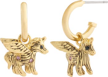 Whimsical pegasus mascots alight with colorful crystals dangle from these gilded hoop earrings with a brushed finish.