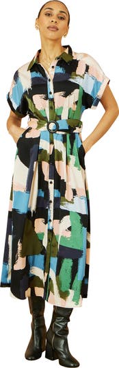 This bold and beautiful belted dress is perfect for office to weekend attire. The big brushstroke print is unique and gives a stand out look. The drop sleeve shape with button down fastening give this shirt dress its relaxed yet chic vibes. Wear with trainers for an easy fit or pair with boots in the cooler weather.