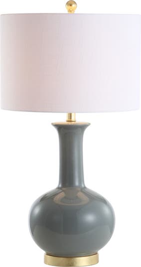 Curves and shine combine to create an alchemy of traditional and modern design in this attractive table lamp. The linen hardback drum shade adds a soft element to the glazed ceramic and brushed brass base. The designer elements extend to the plug, with a 60" silk-wrapped cord.