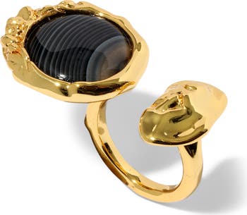 A rippled, 14-karat gold-plated frame wraps your finger and reflects light in this open ring punctuated with a polished banded agate cabochon.