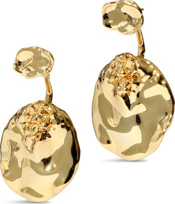 Molten shaping and a front/back design deepen the dimension of these gleaming earrings plated in 14-karat gold to reflect light off every ripple.
