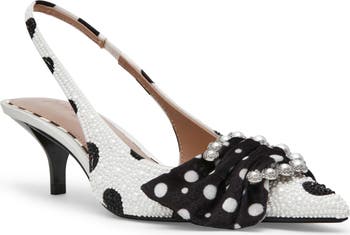 Sparkling crystals and pearly beads highlight the delightful polka-dot pattern of this bow-embellished slingback pump.