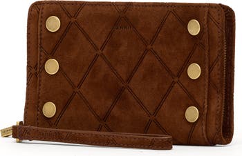 Signature rivets glint at the sides of this slim wallet outfitted with plenty of organized storage and an optional wrist strap.